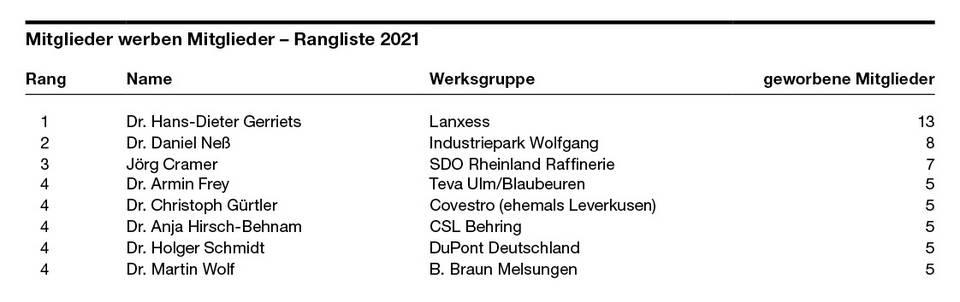 Mit insgesamt 13 geworbenen Neumitgliedern an der Spitze der Rangliste steht wie im Vorjahr Dr. Hans-Dieter Gerriets, Vorsitzender der VAA-Werksgruppe Lanxess. Wie ist es ihm gelungen, trotz der Pandemie erfolgreich Mitglieder zu werben? „Eine Konstante in der Werksgruppenarbeit ist – trotz Pandemie – das Beratungsbedürfnis der Kolleginnen und Kollegen, die sich mit ihren Fragen an einen wenden“, betont Gerriets. „Ein Großteil derer, die noch nicht im VAA sind, nehmen dann meine Hinweise an, darunter auch die Beitrittsempfehlung für unseren Führungskräfteverband.“