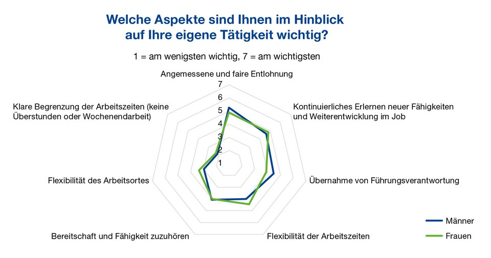 Mit Blick auf die eigene Tätigkeit ist eine Wertschätzung in Form von fairer und angemessener Entlohnung für alle Generationen der wichtigste Aspekt. Je höher die Befragten in der Hierarchie stehen, umso unbedeutender wird er. Der Gen Z ist dieser Punkt im direkten Generationenvergleich am wichtigsten. Eine Erklärung dafür könnte das Ergebnis der VCI-Studie sein, dass die größten Sorgen dieser Generation die Alltagsinflation und bezahlbarer Wohnraum sind. Die Studie stellt zudem heraus, dass „Selbstwirksamkeit und Werkstolz“ für die junge Generation von großer Relevanz sind. Die Ergebnisse der VAA-Umfrage untermauern dies, da das Erlernen neuer Fähigkeiten und die Weiterentwicklung im Job der Gen Z etwas wichtiger als den Befragten der älteren Generationen ist. Auffällig sind die Ergebnisse der VAA-Studie in Bezug auf die Übernahme von Führungsverantwortung. Je höher die Befragten in der Hierarchie standen, umso wichtiger war ihnen diese Erwartung an die eigene Tätigkeit. Männern ist dieser Punkt insgesamt etwas wichtiger als Frauen. Im direkten Gegensatz dazu steht die Flexibilität von Arbeitszeit und -ort, die den Teilnehmerinnen der Studie wichtiger ist als den männlichen Kollegen. Erklärungsansätze dafür liefert eine Studie des Statistischen Bundesamtes. Danach haben Frauen im Jahr 2022 im Durchschnitt fast 60 Prozent der unbezahlten sogenannten Care-Arbeit (Kinderbetreuung, Haushalts- und Pflegearbeit) geleistet, was im Vergleich zu den Männern rund neun Stunden mehr unbezahlter Arbeit pro Woche entspricht. Flexibles Arbeiten könnte für Frauen also besonders wichtig sein, weil sich Beruf und Alltag so besser vereinen lassen. Der klaren „Abgrenzung der Arbeitszeiten“ von allen Generationen wird nur wenig Bedeutung zugemessen.