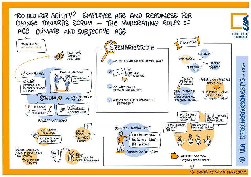 Sind ältere Mitarbeiterinnen und Mitarbeiter zu alt für Agilität? Über diese Frage wurde im Workshop „Too Old for Agility? Employee Age and Readiness for Change towards Scrum – the Moderating Roles of Age Climate and Subjective Age“ diskutiert. Basis des Workshops war ein wissenschaftliches Paper von Ivana Drazic und Prof. Carsten Schermuly vom Lehrstuhl für Wirtschaftspsychologie an der SRH Hochschule Berlin. Dieses konnte zeigen, dass die Bereitschaft zu Scrum – einer agilen Projektarbeitsmethode – mit dem Alter nicht abnimmt. Vielmehr sind das Altersklima – das heißt, wie positiv oder negativ ältere Mitarbeiterinnen und Mitarbeiter im Unternehmen gesehen werden – und das subjektive, gefühlte Alter entscheidend für die Veränderungsbereitschaft zu Scrum.