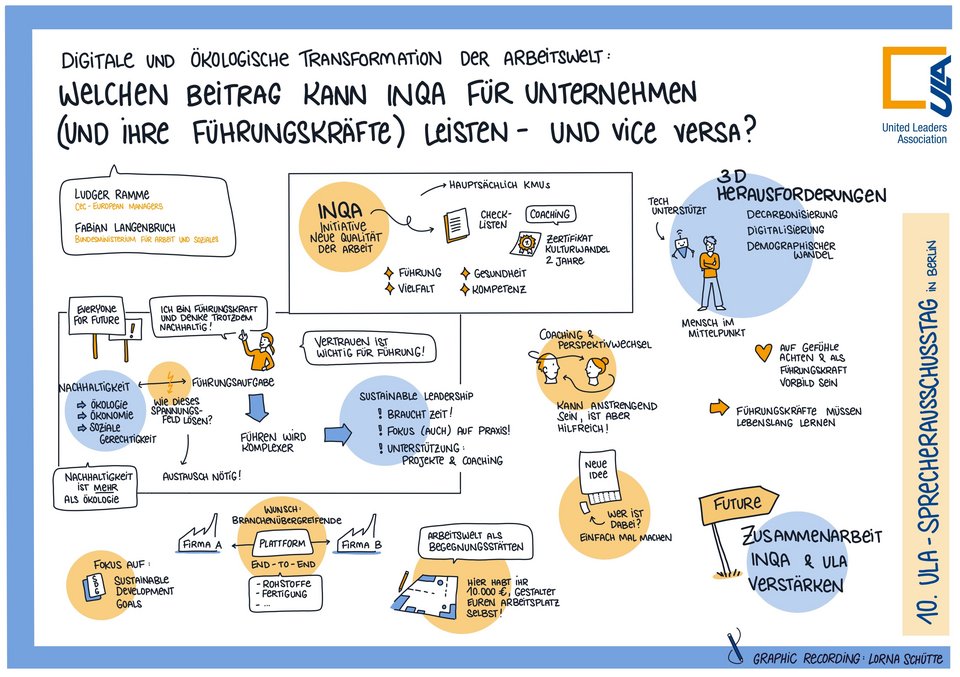 Die ULA unterstreiche die Rolle der Führungskräfte bei der Gewährleistung einer menschlichen Arbeitswelt, hob der Sustainable Leadership Ambassador von der CEC European Managers Ludger Ramme hervor. „Durch nachhaltige Führung – Sustainable Leadership – kann eine neue Stufe der Qualität der Arbeit erreicht werden. Dies wünschen sich INQA und ULA gemeinsam. Grund genug, die Kooperation auszubauen.“